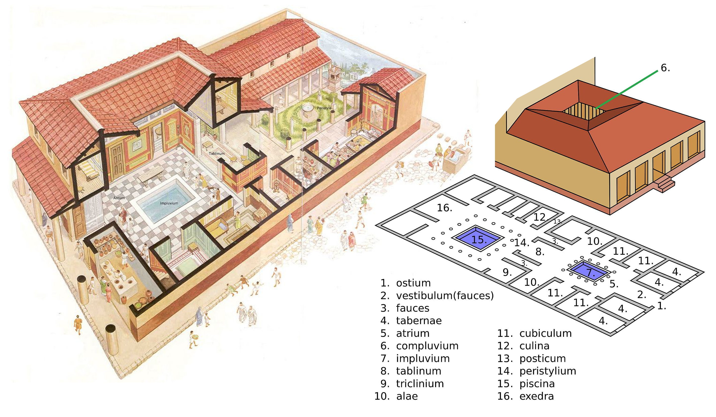 도무스Domus는 상류층의 독립형 개인 주택으로, 흔히 생각하는 상류층의 도시 단독 주택이다. 입구부터 복도, 주방 등 모든 역할의 방들이 저마다의 이름을 갖추고 있는데, 그 중에 ‘입구로 들어와 통로를 지나면 나오는, 천장이 뚫려 있고 가운데 못이 있는 넓은 공간’이 아트리움이다.